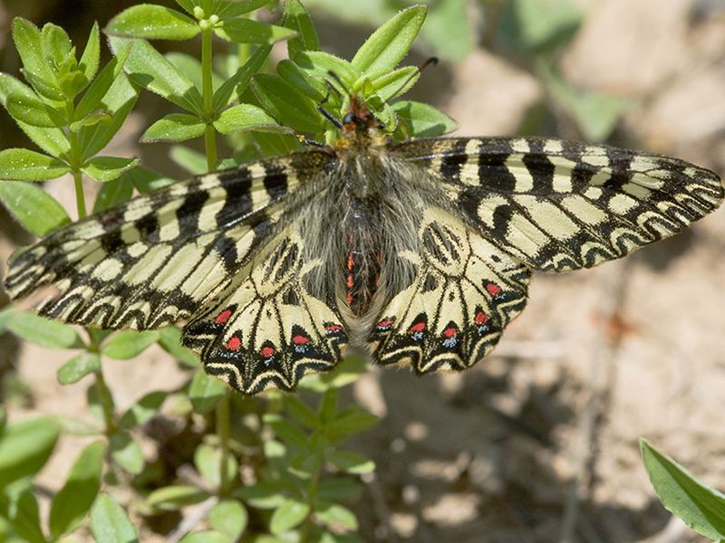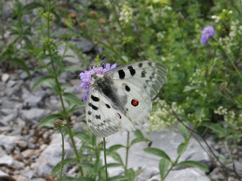 Schmetterling aus der Familie der Ritterfalter, einer der schönsten Tagfalter in Kroatien. Diese Schmetterlingsart lebt auf sehr beschränkten kleinen Räumen, Gebirgswiesen und felsigen Gebirgshabitaten in einer Höhe von 1000 bis 2000 m. Das einzigartige Merkmal dieser Schmetterlingsart sind Flecken in Form von roten Ringen mit weißer Ausfüllung und schwarzer Umrandung.
